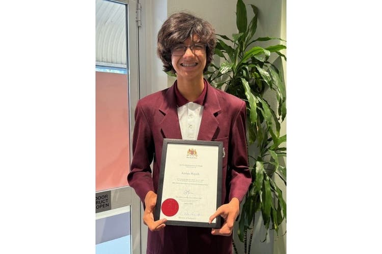 Male student holding a certificate from NSW Parliament for his achievements in Para Sport