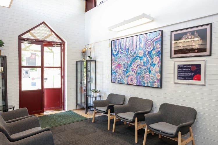 View of the school office facing the front door. There are 3 chairs beneath a blue aboriginal dot painting
