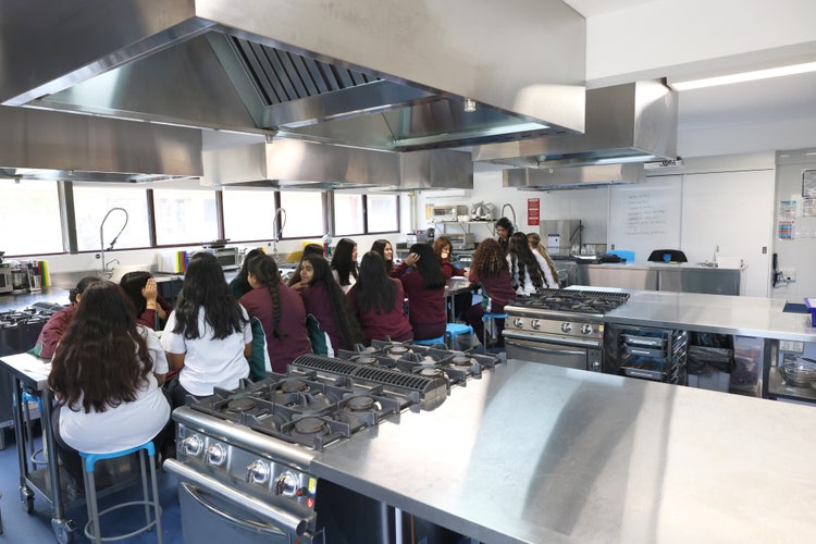 Students sitting at a long centre bench in the industrial kitchen